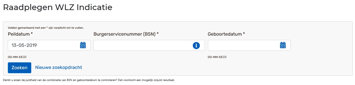 Om naar een Wlz indicatie te zoeken moet u beschikken over het BurgerServiceNummer (BSN) van de klant, de geboortedatum, en de peildatum die van toepassing is op het moment van de zorglevering.